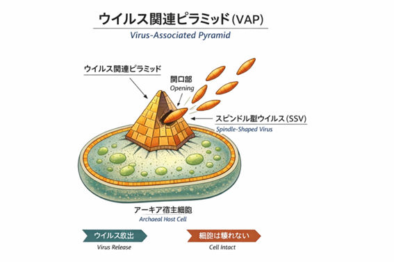 スルフォロブス属アーキアに感染するウイルスは、感染したアーキア細胞を溶かさない。細胞は分裂を続け、代謝も維持される。その細胞表面には、やがてピラミッド状の構造体が形成される。この構造はウイルス関連ピラミッド(VAP: Virus-Associated Pyramids)と呼ばれ、細胞膜を破壊することなく開閉し、開口部からウイルス粒子を外界へと放出する。開口部は小さく、細胞そのものは致命的な損傷を受けない。