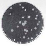 プラーク法:寒天平板上に形成された均一な宿主細胞層の中に、透明な円形の斑点(プラーク)が現れる。プラーク内部ではウイルス感染によって細胞が破壊・剥離し、細胞が「存在しない」状態が可視化されている。円は細胞死の痕跡である。
