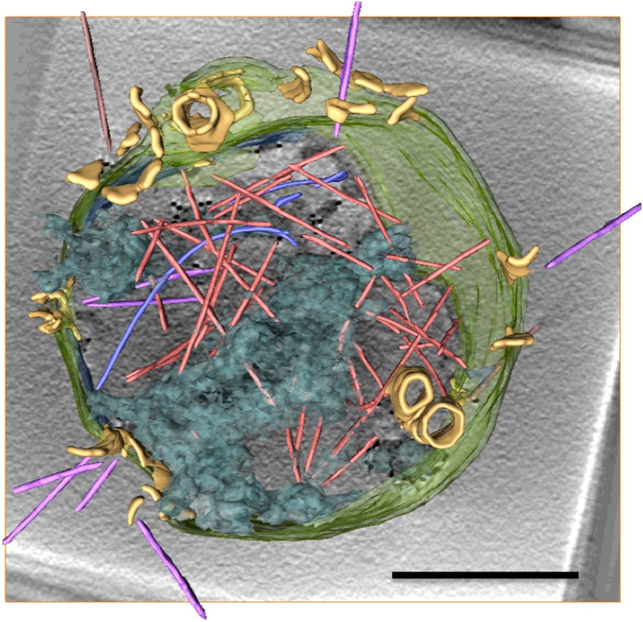 接種12時間後。ウイルス粒子(オレンジ色と紫色の棒、VAP(黄色) 文献1